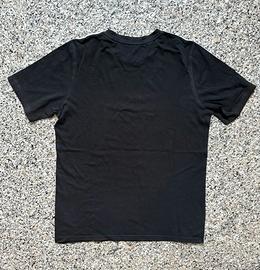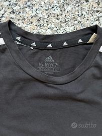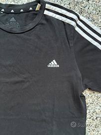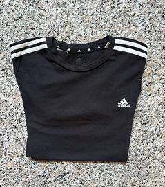 T-shirt Adidas originale in ottime condizioni, nera con le classiche tre strisce bianche sulle spalle e logo Adidas stampato sul petto.