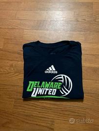 Presenta la stampa sul davanti con il logo Adidas e la scritta "DELAWARE UNITED VOLLEYBALL" in verde acceso e bianco.