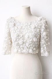 Elegante maglietta/coprispalle di ATELIER EMÈ da cerimonia in organza di seta e tulle, caratterizzata da una raffinata lavorazione floreale tridimensionale che dona volume e romanticismo al capo. Il design presenta uno scollo ampio e una linea morbida, perfetta per valorizzare abiti da sera o da sposa. Capo delicato e femminile, ideale per occasioni speciali come matrimoni, eventi o cerimonie,esclusivo e ricercato, perfetto per completare un look elegante con un tocco romantico e sofisticato. IL PREZZO COMPRATO DA NEGOZIO È VISIBILE SUL CARTELLINO. PREFERIBILE RITIRO A MANO. •Taglia: IT 44 / EUR 38 •Materiale: organza di seta e tulle •Colore: bianco/avorio •Condizioni: (mai indossata/con cartellino)