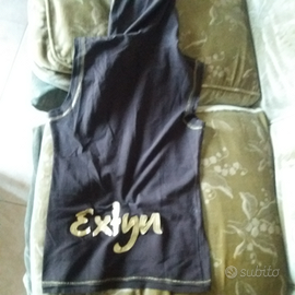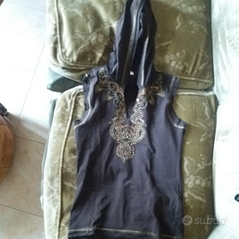 Vendo bella canotta estiva in cotone elasticizzato, color marrone con ricami dorati. Molto bella ed elegante, con cappuccio che la rende anche casual - sportiva.