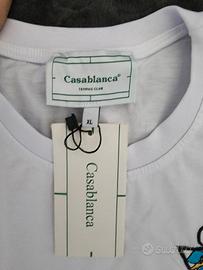 * Frontale: La parte anteriore è il fulcro del design. Sulla parte sinistra del petto, si trova un'elegante stampa o ricamo che raffigura un cigno in volo sopra un motivo a quadri nei toni del blu e del celeste. Sotto il logo, è presente la scritta "CASA BLANCA PAR AVION", un tocco distintivo che richiama l'estetica sofisticata e ispirata al tennis del brand. Il resto della maglietta è di un bianco puro e senza altre stampe, confermando un look minimalista e versatile.