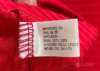 Maglietta colore rosso corallo, manica corta e scollo tondo, 100% seta. Lavorazione a coste elastiche. Brand CHERIE. Taglia 46. Perfette condizioni, usato ma con riguardo. Nessun filo tirato, nessun buco o rammendo, nessuna scucitura o macchia. Capo pulito. Pratica come sottogiacca, è perfetta anche come capo singolo, per la leggerezza e freschezza del tessuto. Dimensioni in cm: spalle 40, girovita 104, da spalla a bordo inferiore 65, manica da spalla 37, da ascella 23. Peso: 220 gr