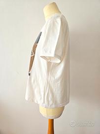 Immergiti nel lusso e nell'arte con questa esclusiva maglietta Marina Rinaldi. Con un design astratto che cattura lo sguardo, questa maglietta è un vero capolavoro di stile. I colori audaci di giallo e blu si fondono con tocchi di marrone terroso, creando un'opera d'arte indossabile che non passerà inosservata. Motivi grafici circolari e forme fogliari stilizzate si uniscono in un affascinante gioco di colori e forme. Tessuto di alta qualità che garantisce comfort e durata.Taglio classico che offre una vestibilità confortevole e adatta a ogni figura. Perfetta per essere abbinata sia a jeans per un look casual che a una gonna per un outfit più ricercato. In perfette condizioni, senza difetti.