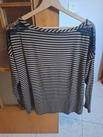 Maglietta a maniche lunghe a righe nero e marrone con spalline di pizzo nero della Conbipel. Taglia M. 95% viscosa, 5% elastane. In ottime condizioni.