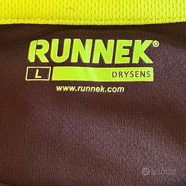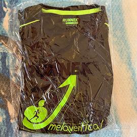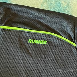 Maglietta da running RUNNEK di colore nero, taglia L. Presenta dettagli a contrasto in verde fluo. - Logo RUNNEK sul petto e sulla manica. - Inserti in mesh per la traspirazione. Nuova mai indossata e ancora confezionata