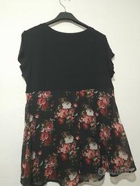 maglietta con motivo floreale a velo con sotto maglina con sopra disegno a strass e dietro di sotto bottoncini a fila finti