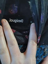Bellissima maglia a maniche lunghe in tulle patchwork, nata dall'esclusiva collaborazione tra Desigual e lo stilista Christian Lacroix. Un pezzo artistico e versatile, perfetto per chi ama lo stile boho-chic e originale. Design: mix di stampe digitali con motivi a pois bianchi e fantasie floreali su base nera. Dettagli maniche: maniche lunghe con particolari volants/arricciature sui polsini che creano un movimento elegante. Collo: taglio a lupetto (collo alto) molto raffinato. Tessuto: Tulle semitrasparente leggero, morbido ed elasticizzato (93% Poliestere, 7% Elastane). Fit: Veste perfettamente sia una S che una M grazie alla componente stretch del materiale.