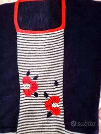maglietta di cotone originale anni 60 a righe blu scuro e bianco con ricamo di fiori rossi e bordo rosso e due taschine piccole