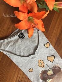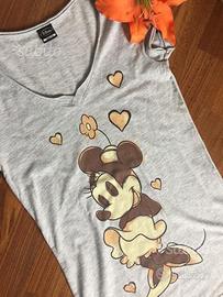 T-shirt magliettina della Only per Disney, grigio chiaro mélange con Topolina tutta cuoriciosa!.. comprata perché mi è piaciuta tantissimo ma messa un paio di volte perché diciamocelo..non ho più l'età!!!... è una taglia S ma vi assicuro che veste molto piccolo, quindi indicata per una XS.. è un modello aderente, lo scollo non è eccessivo, non è corta (arriva ai fianchi) e la manichina è una bella via di mezzo tra la canottiera e la maglietta!..