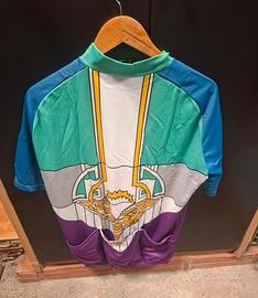 Maglietta e pantaloncini da ciclismo con un design colorato. Maglietta con zip frontale. Maniche corte. Pantaloncini con elastico in vita.