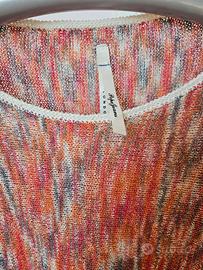 collo leggermente a barca e maniche a chimono a 3/4 con ampia fascia alle estremità ( circa 20 cm) che ne permette un'ottima adesione e di regolare la lunghezza. la stessa fascia con caratteristiche identiche si trova ai margini inferiori. la scollatura è arricchita con discreto ma raffinato giro all'uncinetto