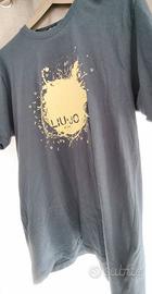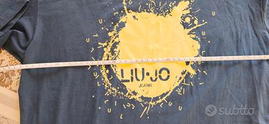 Vendo questa T-shirt a manica corta di Liu-Jo Jeans da uomo. È un bel blu scuro con una stampa frontale grande e vistosa, un logo "splash" in giallo brillante che dice "LIU•JO JEANS". Il giallo è ancora bello vivo.