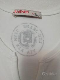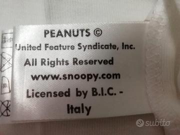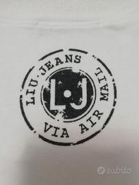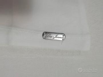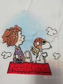 Maglietta in cotone bianca senza maniche, marchio "LIU JEANS BY LIU JO", con etichetta originalità del marchio e del prodotto. Stampa con strass dei personaggi Peanuts. Taglia S. Misure: torace 36 cm, lunghezza 55 cm, larghezza spalle 27 cm, larghezza base 38 cm. Indossata un paio di volte.