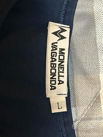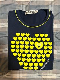 Questa è una maglia a maniche lunghe blu scuro del brand italiano Monella Vagabonda, un marchio diventato un'icona della moda "teen" in Italia nei primi anni 2000. Dettagli del Capo Design: Presenta un grande cuore sul petto composto da tanti piccoli cuori gialli stampati. Uno di questi cuori contiene il logo "MV" stilizzato del brand. Caratteristiche: Il girocollo ha un profilo giallo a contrasto che richiama il colore della stampa. Il nome del brand "Monella Vagabonda" è stampato in diagonale lungo il bordo inferiore del cuore. Stile: Fa parte dell'estetica nostalgica degli anni 2000, periodo in cui il marchio era onnipresente con il suo celebre logo della rana verde. Mai indossato