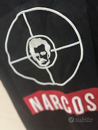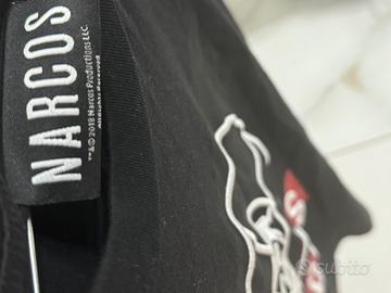 Maglietta taglia s vestibilità comoda uomo sul petto c’è la scritta NARCOS e un piccolo disegno ricamato in cotone del volto di pablo escobar MATERIALE cotone , COLORE nera ,indossata pochissime volte e curata in ogni dettaglio