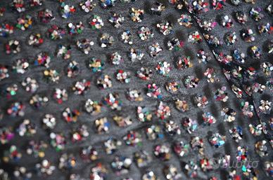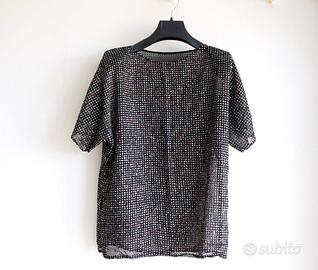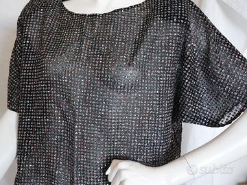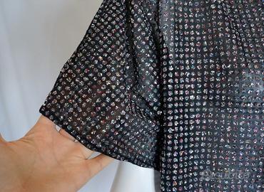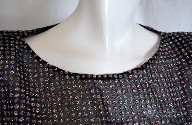 Maglietta nera semi-trasperente ricoperta di scintillanti micro paillettes incollate a formare un pavé di brillantini. Una meraviglia per andare a ballare negli anni '80, come si vede anche dalle spalle imbottite. Condizioni ottime, senza difetti.