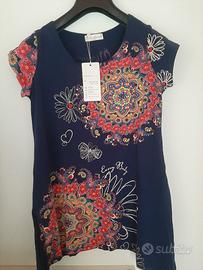 una maglietta a maniche corte, caratterizzata da vivaci stampe floreali e mandala su una base blu scuro. Questo stile è molto simile a quello del marchioDesigual, noto per i suoi disegni artistici e colorati che spesso includono motivi etnici e floreali. Sebbene l'etichetta visibile non indichi esplicitamente il brand, il design condivide forti somiglianze visive con diversi modelli di questo marchio. Caratteristiche principali: Colore base:Blu scuro (marino). Design:Motivi a mandala grandi e colorati e stampe di fiori e farfalle. Dettagli:Alcuni modelli simili presentano piccoli ornamenti come strass o perline per esaltare i disegni.