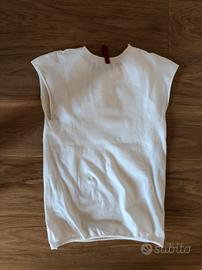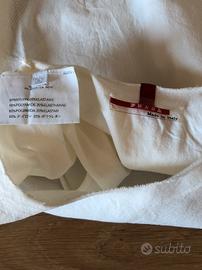 Vendo maglietta originale Prada usata tenuta bene, colore bianco, taglia M ma veste molto attillata quindi una S/XS, lungo i fianchi ha il tessuto più largo come traspirante x attività sportive, composizione 80%poliestere 20%elastan
