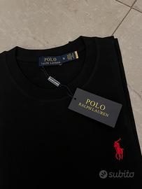 Vendo t-shirt Polo Ralph Lauren, colore nero con l'iconico logo del giocatore di polo ricamato in rosso a contrasto sul petto. Il capo è nuovo con cartellino, mai indossato e in condizioni impeccabili, come visibile dalle foto. Realizzata in cotone di alta qualità, offre una vestibilità Regular Fit molto confortevole e versatile per ogni outfit. La taglia è una M, ideale sia per un look casual che per uno stile più curato sotto una giacca. Spedizione rapida e massima serietà garantita per questo classico intramontabile del guardaroba maschile.