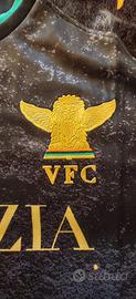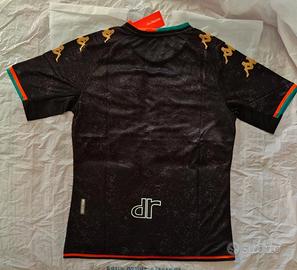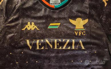 Maglietta Retrò Del Venezia Calcio. Disponibile Taglie M-L. Bellissima maglietta del Venezia calcio. Colore dominante Nero/Oro. Patch in rilievo color Oro. Stelline dorate anteriori che formano la "V" di Venezia. Rifiniture in tessuto cucito Verde/Arancione