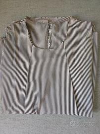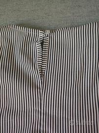 Maglietta smanicata, più larga in vita, bianca con righe sottili nere, taglia S ma veste anche M.