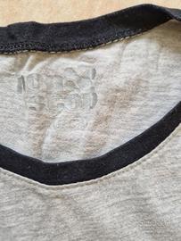 Una t-shirt grigio chiaro a coste con bordi neri a contrasto sul collo e sulle maniche (stile ringer). Ha una stampa grafica centrale con il testo 'LIFE IS GOOD with you' in un font bold grigio, incorniciato da rose rosse realistiche