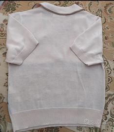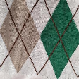 Maglietta Stradivarius con un classico motivo a rombi. - Scollo a V con colletto. - Maniche corte. - Motivo a rombi verde e beige su fondo bianco.