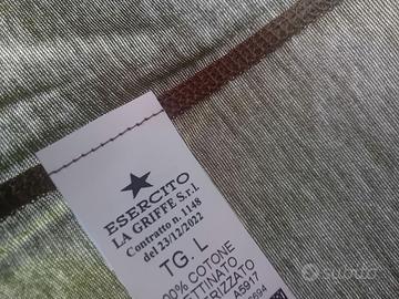 Autenticità: Etichetta originale che riporta il logo a stella, e il fornitore ufficiale "LA GRIFFE S.r.l.". Colore: Verde Oliva d'ordinanza (come da foto). Taglia: L Tessuto: 100% Cotone Pettinato e Mercerizzato. Qualità del Tessuto: Il cotone mercerizzato è un trattamento di alta qualità che rende il filato più lucido, setoso al tatto e molto resistente, ideale per l'uso tecnico-militare. Dettagli: Cuciture a quattro aghi per una massima robustezza e comfort sulla pelle.