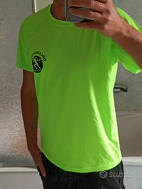 Vendo t-shirt da trail, marca Roly, taglia media, larghezza spalle 45 cm, lunghezza 62 cm, colore blu, 100 % poliestere, usata pochissimo, come nuova eccetto un piccolissimo puntino nero dietro al collo (vedi foto).