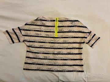 Maglietta maniche corte Tezenis a righe bianche e nere. Tessuto traforato tipo pizzo. Vestibilità ampia. Cerniera sul retro con contorno giallo fluo. Capo utilizzato una sola volta causa regalo non adatto