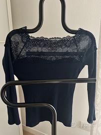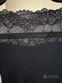 Maglietta in cotone elasticizzato a costine, colore blu notte, con pizzo nel decolletè. Manica lunga, taglia M. Da usarsi sia come sotto giacca, maglietta top o intimo. #top #elasticizzato #underwearwoman #darkbluelace #Schutzzahlung #longsleevestop