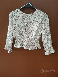 Magliettina bianca e fiorata a maniche lunghe ma molto leggera, corta in vita e più lunghetta dietro. Taglia S. MAI utilizzata.
