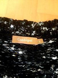 Maglioncino Combipel da donna, taglia L, colore nero e bianco effetto “sale e pepe”. Lavorazione particolare a corda che lo rende diverso dai soliti maglioni. Taglio dritto e girocollo classico, comodo e facile da abbinare.