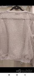 Maglioncino Zara corto leggero in uno strato di sottile di filo tipo mohair con sopra un tessuto velato pieno di piccolissime perline e paillettes trasparenti discretamente luminose.