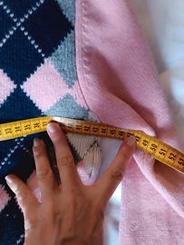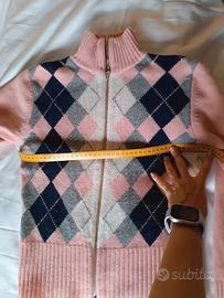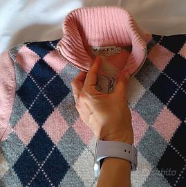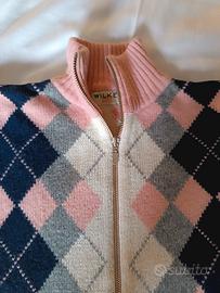 Maglioncino con zip WILKER, taglia S, con fantasia argyle nei toni rosa, grigio e blu navy. Composizione: 80% lambswool, 20% nylon. Colletto a coste rosa, zip frontale perfettamente funzionante, interno pulito.
