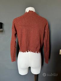 Maglioncino corto color ruggine con scollo a V e dettagli effetto destroyed su collo e fondo.