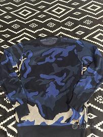 Maglione originale Dsquared2 in fantasia camouflage blu e grigio. Tessuto caldo e di qualità, perfetto per la stagione autunnale e invernale. Vestibilità comoda e design moderno, ideale per un look casual ma ricercato.
