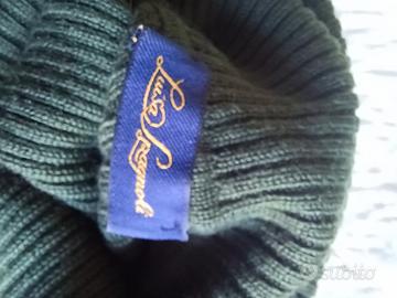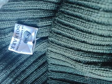 Maglioncino verde scuro di lana a costine con treccia trasversale sul davanti. Collo alto e largo, ripiegabile più volte. Taglia 42