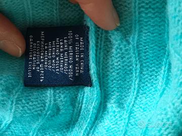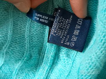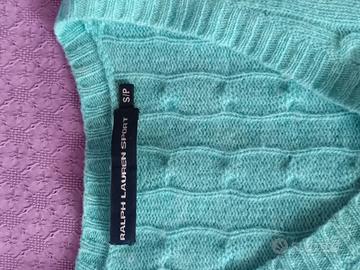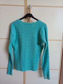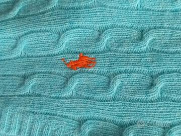 Maglioncino Ralph Lauren a trecce in lana merinos, scollo a V, taglia S color verde acqua e stemma arancione