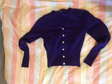 Simpatico maglioncino viola, marca Native, con “pallini” decorativi sulla parte superiore e sulle spalle. Maniche lunghe, strette ai polsi, da ripiegare o arricciare. Usato solo 2 volte in ottime condizioni.