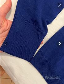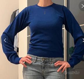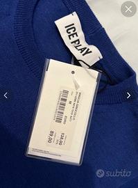 Maglione in 100% lana vergine, filato sottile e morbidissimo. Marchio Iceplay by Iceberg. Made in Italy. Taglia M. Corto in vita, busto aderente e maniche ampie. Mai indossato, nuovo con cartellino. Colore blu intenso.