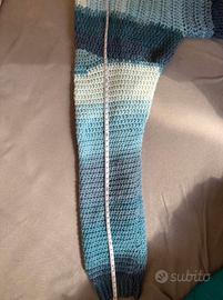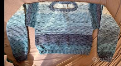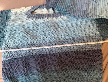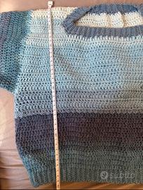 Maglione all'uncinetto fatto a mano. Filato acrilico, leggermente elastico. Lunghezza: 49 cm Busto: 43 cm Vita: 36 cm Maniche: 53 cm ISTRUZIONI DI LAVAGGIO: Lavaggio: Lavabile in lavatrice con ciclo delicato/a freddo con acqua tiepida (non calda). La maggior parte dei filati acrilici resiste a temperature fino a 30-40 °C. Utilizzare un detersivo delicato. Asciugatura: Non asciugare in asciugatrice ad alta temperatura. L'acrilico è una fibra a base di plastica e il calore può fonderla o deformarla in modo permanente. Asciugare in asciugatrice a bassa temperatura oppure Stendere in piano ad asciugare (opzione migliore per mantenere la forma del maglione). Stiratura: Non stirare direttamente. Se necessario, utilizzare un panno da stiro a bassa temperatura o vaporizzare da lontano. Il calore elevato rovinerà l'acrilico. Lavaggio a secco: Non necessario e generalmente sconsigliato.