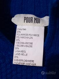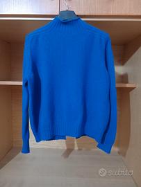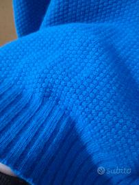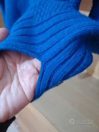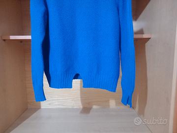 Maglione in perfetto stato: no nodini, no infeltrimenti. Presenta un collo a lupetto con apertura a V e un design a trama testurizzata. I polsini sono aperti e sul bordo in vita, sul davanti, ha un altro spacchetto. Guarda etichetta della composizione. Manca la taglia, per questo indico alcune misure, in cm: ascelle 50, interno manica 40, giro vita 92, lunghezza 50. Il colore è meno acceso rispetto alle foto, è comunque un blu intenso