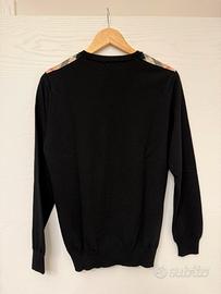 Maglione originale Burberry Brit in colore nero. Il capo presenta l'iconico motivo Nova Check (il classico quadrettato Burberry) lungo le cuciture delle spalle e all'interno del colletto,l.