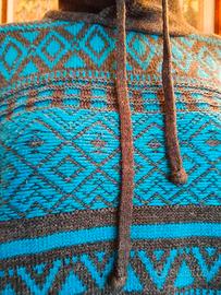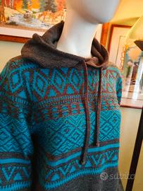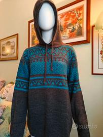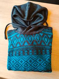 Bellissimo maglioncino grigio con cappuccio e coulisse, decorato con greche color turchese ottanio.