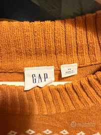 Splendido maglione in una calda tonalità arancio bruciato / zucca, perfetto per l'autunno e l'inverno. Il capo è caratterizzato da una bellissima fantasia geometrica a contrasto di colore bianco/crema che decora il petto e le maniche.