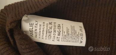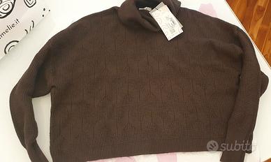 Maglione corto da donna con collo di colore marrone. Lavorazione geometrica sul davanti. Taglia Unica, veste sia una small che una Large. Molto morbido con confezione originale e sacchetto. marca Amelie