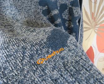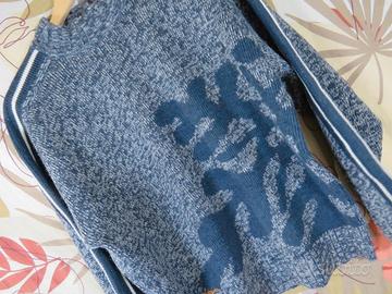 Maglione da donna in maglia blu scuro, con strisce bianche sulle maniche. Caldissimo ideale anche per attività all'aperto