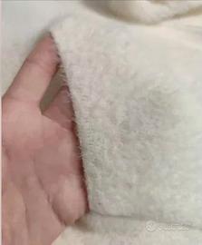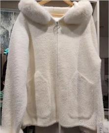 Maglione da donna in angora, taglia 50-52, bianco latte, nuovo con etichetta. Il tessuto morbido ed elastico è piacevole sulla pelle, offrendo comfort e calore nelle giornate più fresche. Il bordo in pelliccia è staccabile. Lunghezza schiena 69 cm; lunghezza manica dalla spalla 66 cm; larghezza sotto le maniche 119 cm.