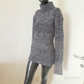 HAND MADE Maglione invernale dolcevita, lana blu/panna melange, fatto a mano, sciancrato, maniche lunghe con risvolto, collo alto con risvolto, tg.M donna